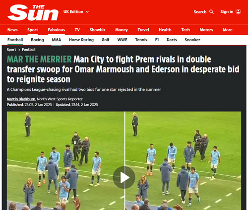 Upon verification, the source of the fake rumours which claimed that Manchester City "hopes" to sign Marmoush and Ederson from Frankfurt and Atalanta respectively to "turn around their poor season" actually does not come from the Daily Mail at all, but the regular representative of our website's "Daily Slap in the Face Party", the UK's extremely notorious British media outlet The Sun!